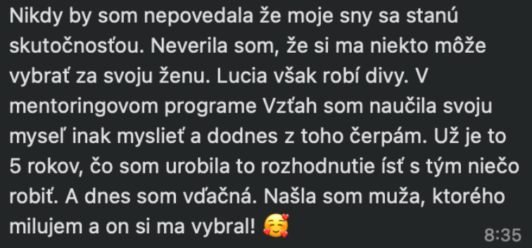 Baby, to, čo Lucka učí, fakt to funguje! Našla som vzťah za ani nie mesiac, čo som začala pracovať v mentoringovej skupine. Nechápem :)."