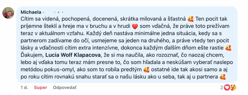 "Luci, naše prednášky si prechádzam už tretí krát celé...milujem ich. Už ich viem aj naspamäť, ale stále prichádzajú nové aha momenty. Som šťastná, že som sa k Tebe dostala!!!!"