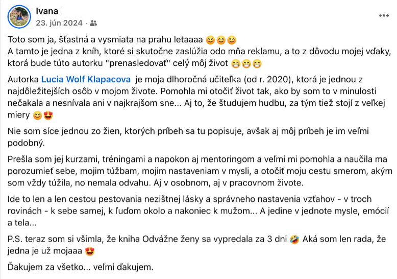 "Luci, Ty si brutálna! Nič nám neodpustíš, ale zároveň tak chápeš! Milujem, že všetko, čo učíš, sama robíš. Tebe to verím, nie sú to kecy, ale prax. Preto, čo hovoríš aj robím, a mám výsledky ako nikde inde."