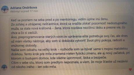 Moja cesta sa ešte neskončila, ale mentoring mi poskytol pevný základ, z ktorého môžem ďalej rásť – vo vzťahu k sebe samej, ale aj smerom k budúcim vzťahom s inými ľuďmi. Ďakujem za všetko.